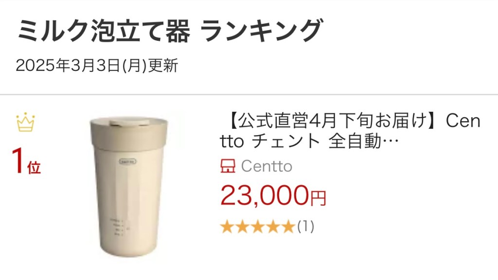 Centto(チェント)全自動ミルクフォーマーが販売中の楽天市場の「ミルク泡立て器」部門にて1位を獲得しました。(2025年3月3日時点)